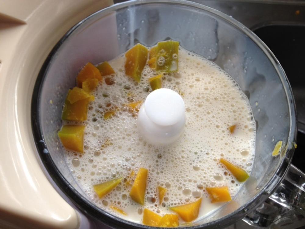 ![]() 1のカボチャが柔らかくなったら豆乳とフードプロセッサーにかけます。