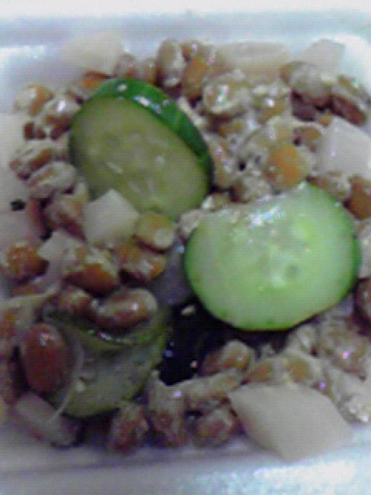 納豆をよく混ぜ、梅とすりごまを加えて、さらに混ぜます。