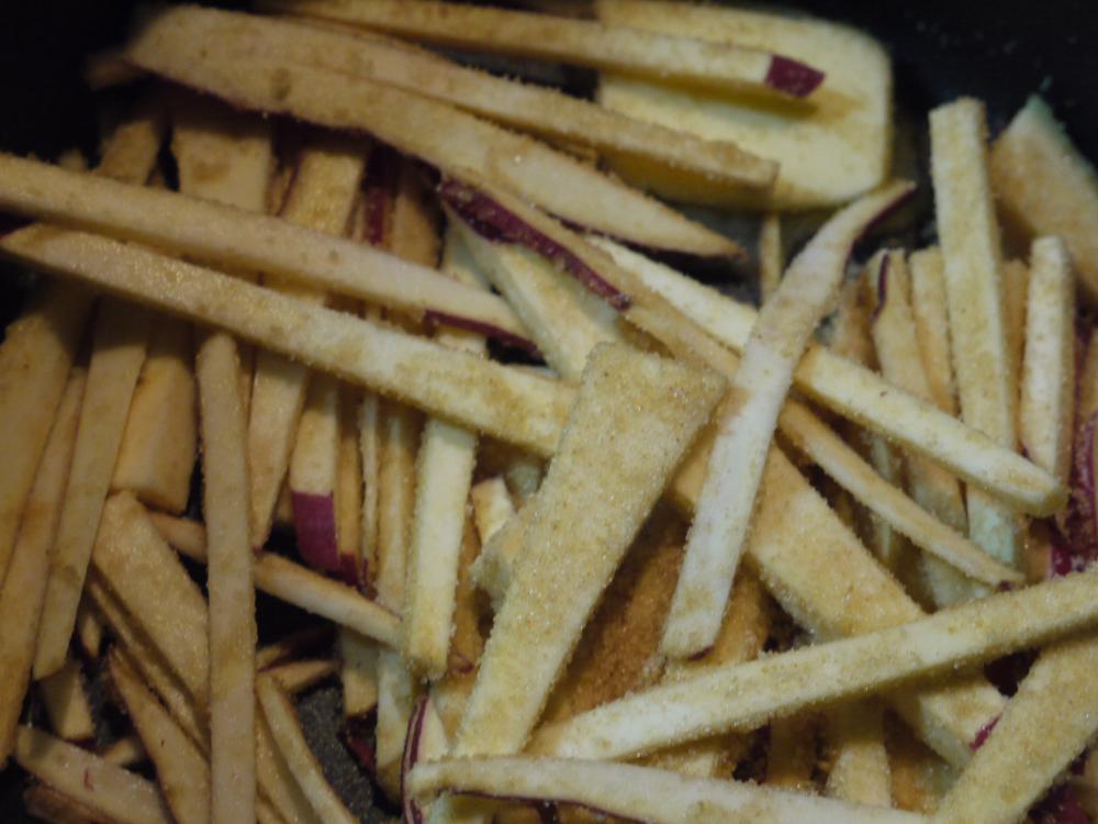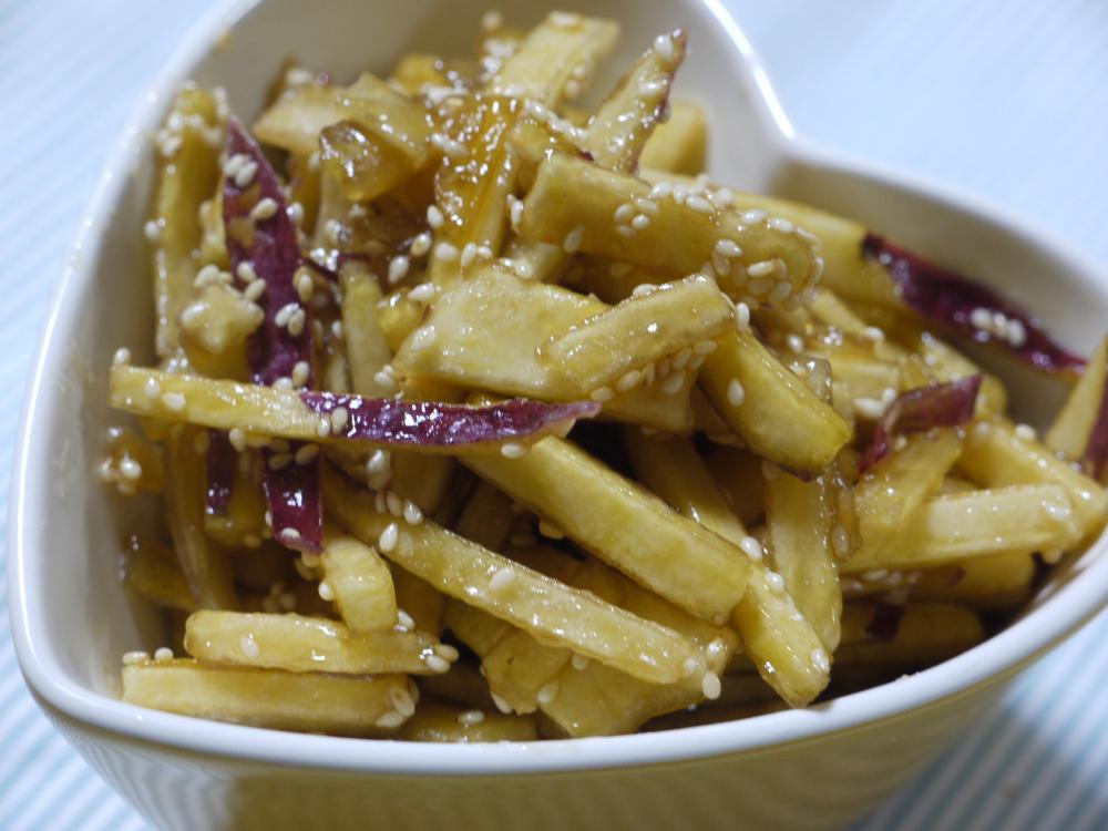![]() さつま芋を縦に薄切りにし、さらに細切りにする。