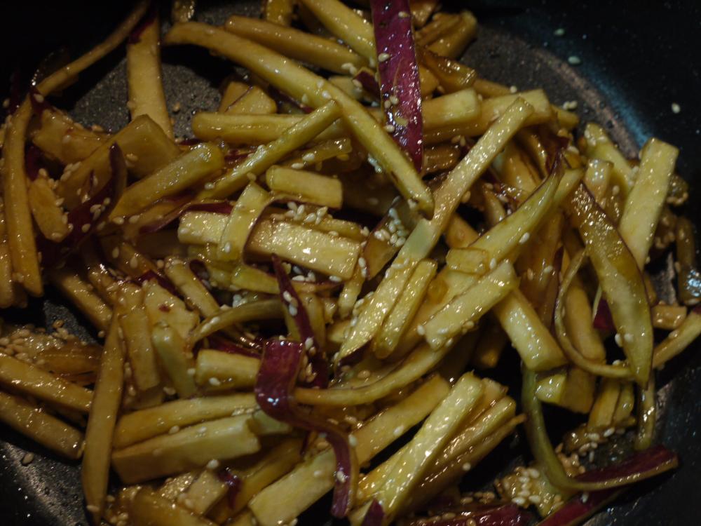 ![]() 水分が出てくるので蒸し焼きにし、火が通ってきたら時々全体をかき混ぜてさらに蓋をして熱す。仕上げに水分を飛ばし胡麻をふる。