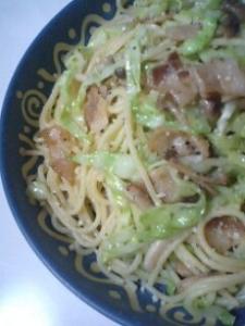 パスタが茹で上がったら、千切りにしたキャベツと一緒に、サッとオイルソースと絡め、仕上げに粉チーズ、オリーブ油をかけます。