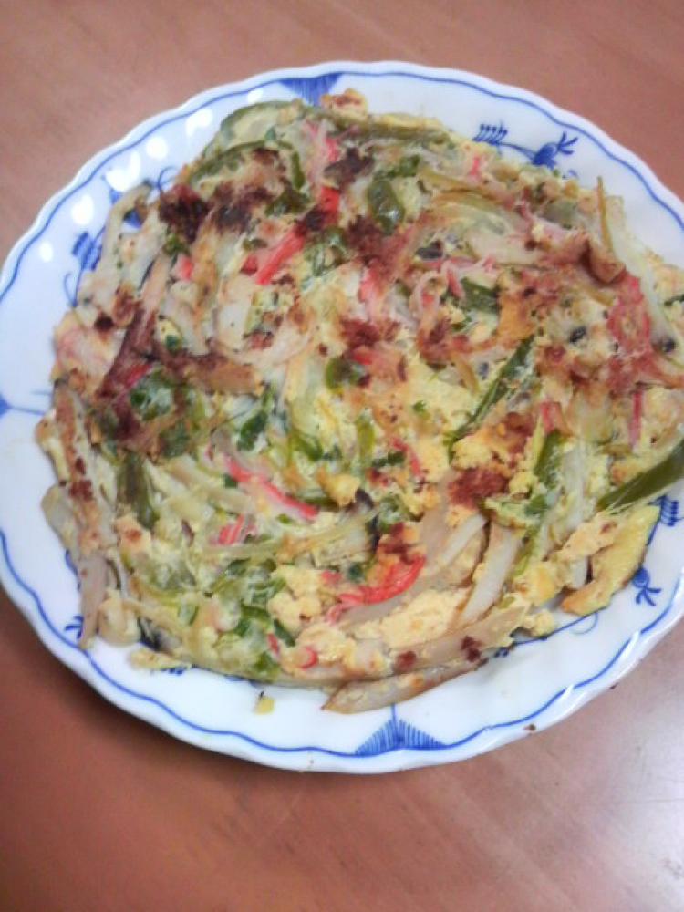 (3)ボールに卵後割りいれ混ぜたら(2)で炒めた材料と顆粒コンソメを加えてさらに良く混ぜる。