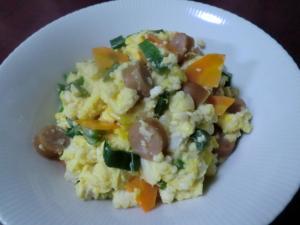 ソーセージは7~8㎜幅に切り、ニンジンは薄いいちょう切り、ネギはぶつ切りにします。