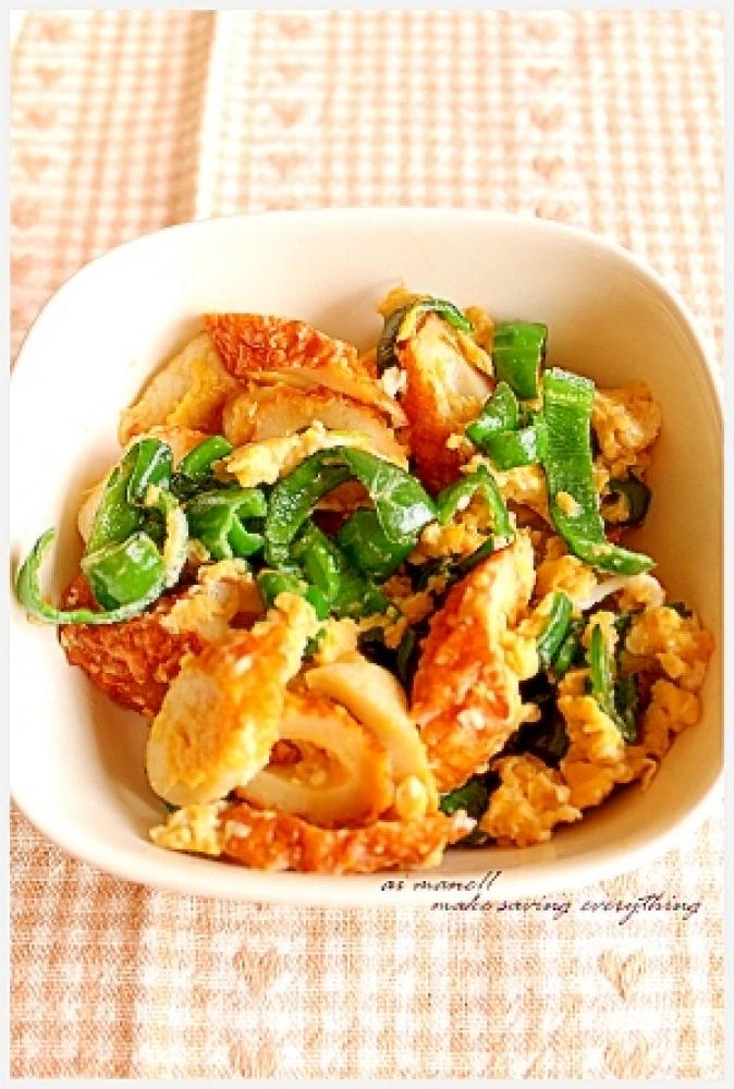 ピーマンは細切り、竹輪は斜め薄切りにします。