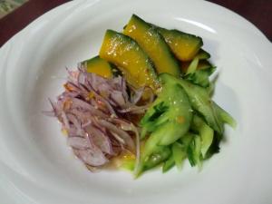 カボチャは6~7mm厚さの薄切りにし、柔らかくなるまで茹でます。玉ネギは、薄切りにして、水にさらします。