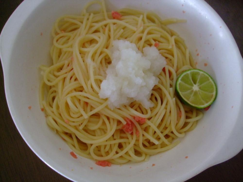 ![]() 明太子をほぐして混ぜ、大根おろしを乗せてスダチを搾ります