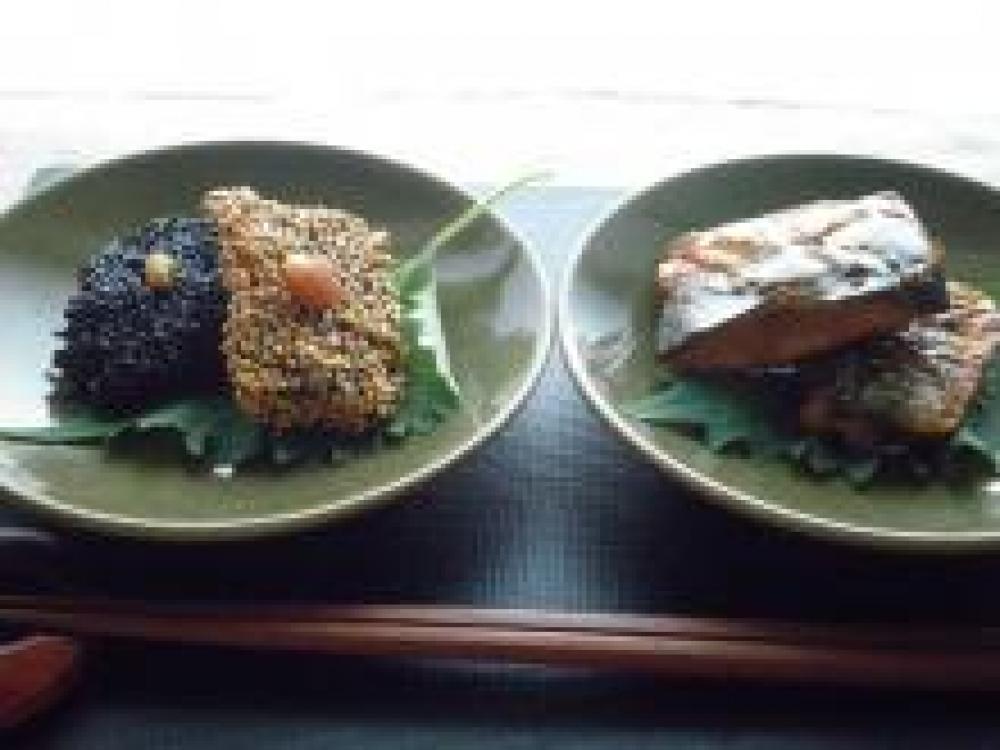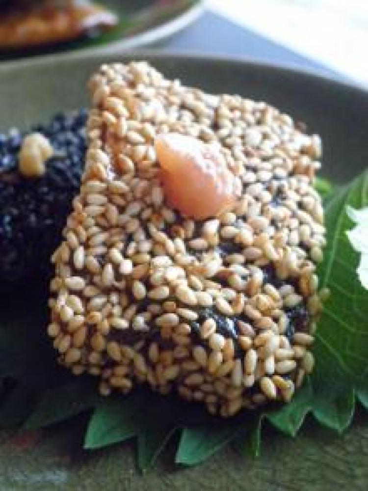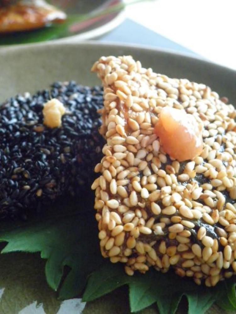 ![]() バットにそれぞれごま敷き詰め、秋刀魚の両面につける。器に秋刀魚をのせ、練り梅を添える。