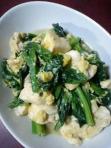 ホウレン草を加えてさらに炒め、しんなりしたらAを加えてサッと混ぜ溶き卵を回し入れ手早く混ぜます。
