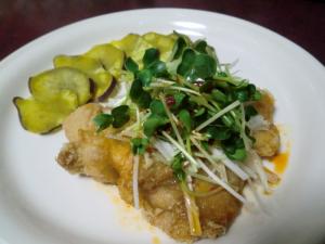 6の肉を器に盛り、7のネギ、カイワレをのせてBを回しかけ、サツマイモのチップスを添えます。