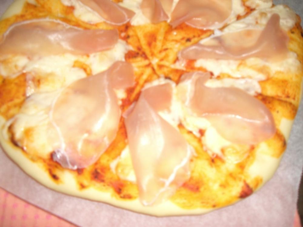 ![]() 35℃で15分発酵後、200℃に予熱したオーブンで15分焼いてから生ハムを乗せる。