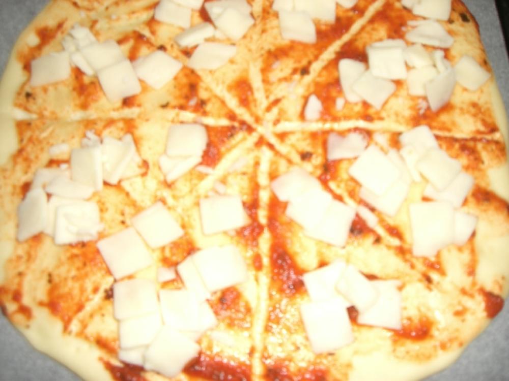 ![]() 軽くガス抜きをして4個に分けて20分ベンチタイムし、長径20㎝の円に伸ばしBを乗せる