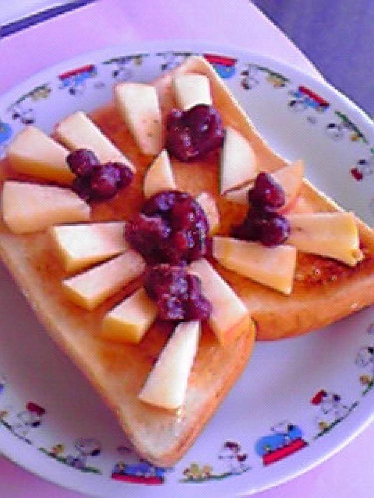 りんごを並べ、あずきをトッピングします。 シナモンパウダーをふって仕上げます。 |