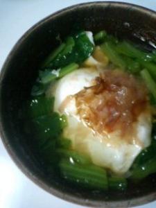 削り節をレンジで30秒加熱し、水分を飛ばします。(これで香りもよくなります)2をお椀に盛り、削り節を添えます。
