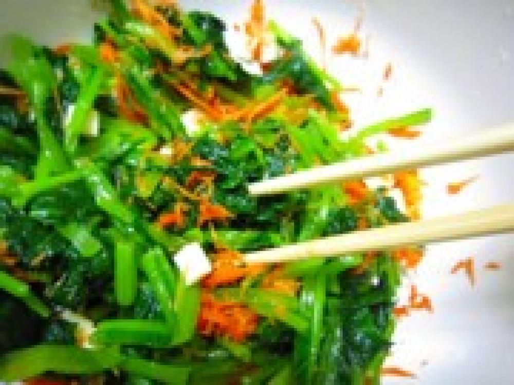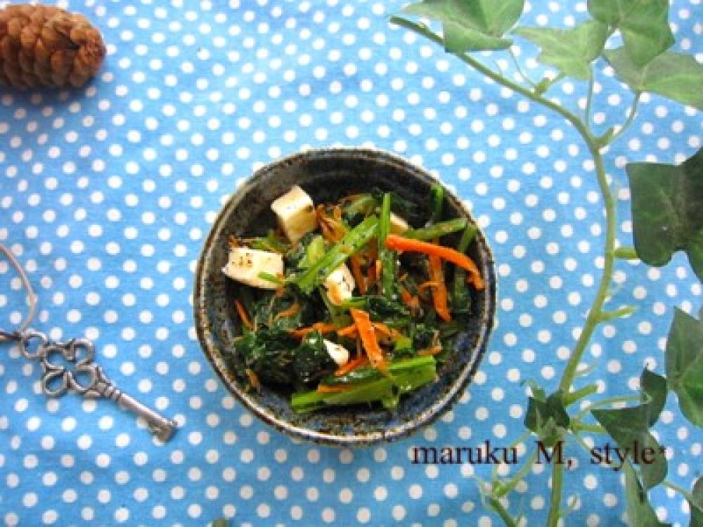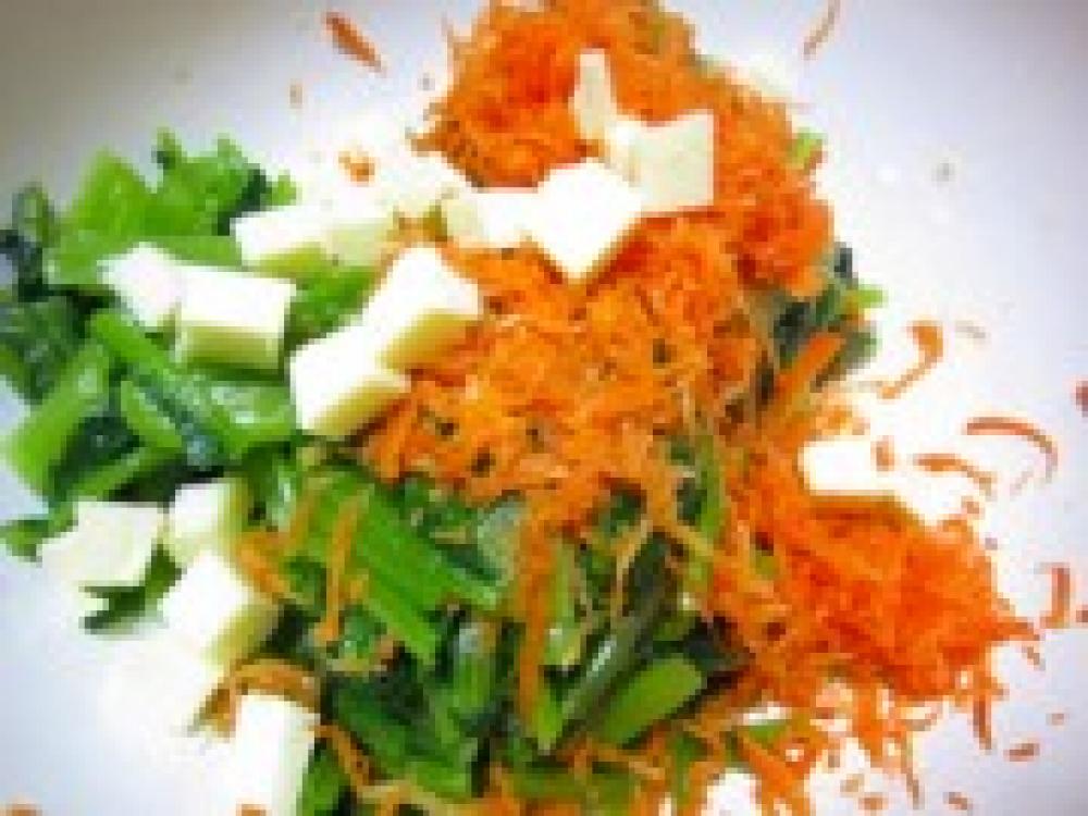 ![]() ボールに適宜に切って水気をよくしぼった小松菜、スライサーした人参、