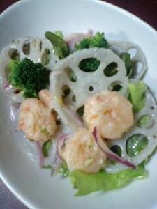 エビに薄力粉をまぶし、4分位揚げ、3に漬け込みます。ちぎったレタスを加えて器に盛ります。