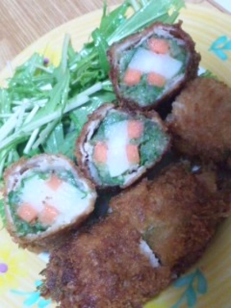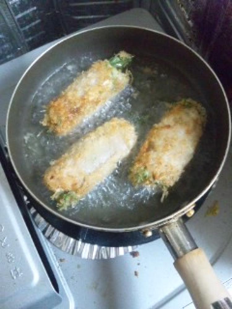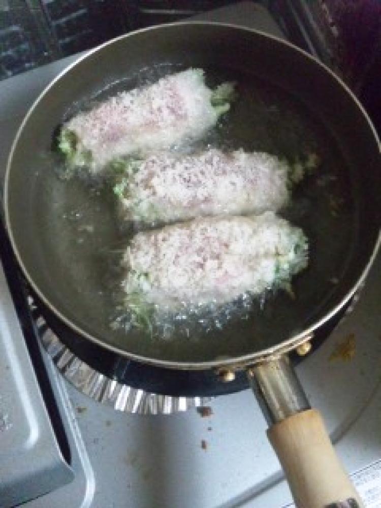 ![]() フライパンに少し大目に油を入れ、熱したら、巻き終わりを下にして、揚げ焼きします。