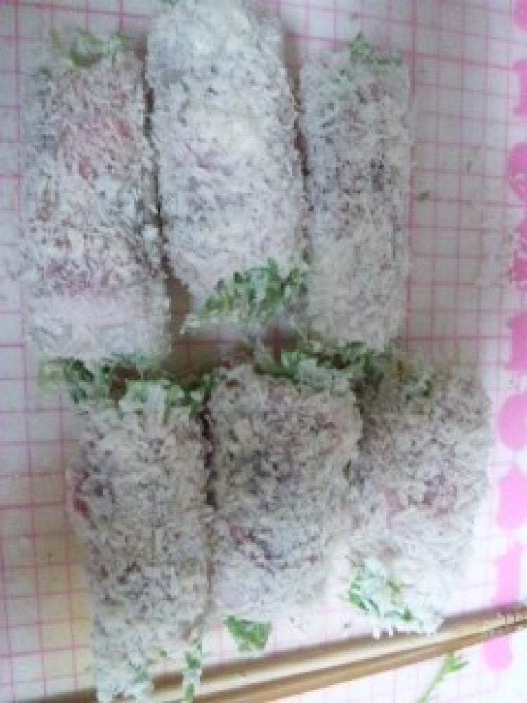 ![]() 小麦粉⇒溶き卵⇒パン粉の順につけます。