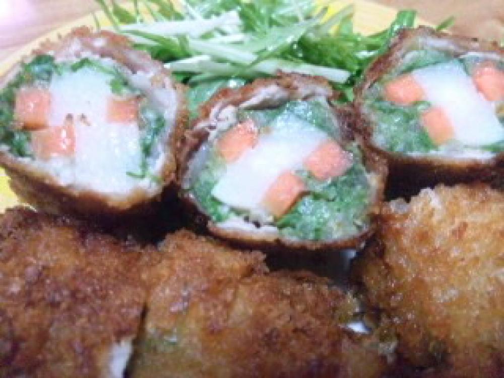 ![]() 広げた豚肉に塩コショウをし、水菜を豚肉の半分くらいまで広げ、その上に長芋と人参を並べます。