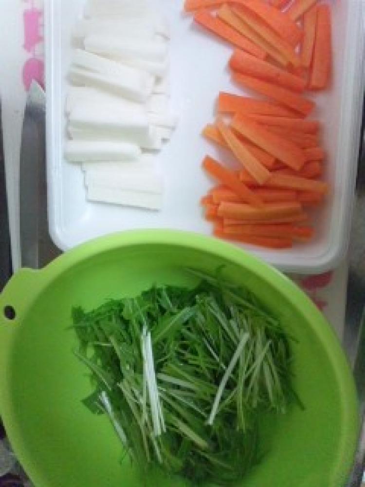 ![]() 水菜は5センチくらい切り、人参は約5ミリの太さ、長芋は約1センチの太さに短冊切りをします。