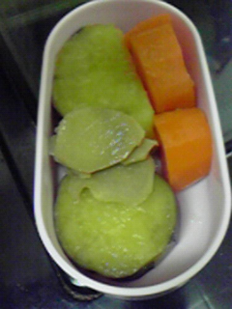 さつまいもと人参は1.5cmの輪切りにし、生姜は薄くスライスします。