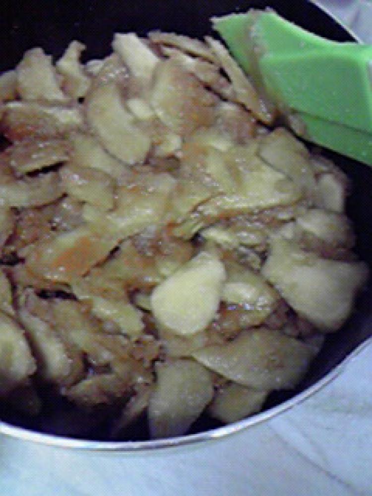 ![]() 生姜の水分が出てきたら、水を加えて火にかけます。