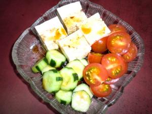 ミニトマトはヘタを取り、半分に切り、キュウリは縞目に皮をむき輪切りにします。サッと塩でもんで洗い流しておきます。
