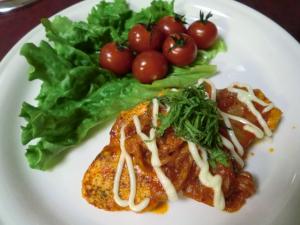 器にレタスを敷いて4を盛り、マヨネーズ、青ジソの葉をかけます。ミニトマトを添えます。