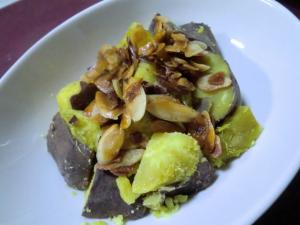 サツマイモは皮をよく洗い、塩少々を入れた熱湯で茹で、水気を切って、ザッとつぶし、器に盛ります。