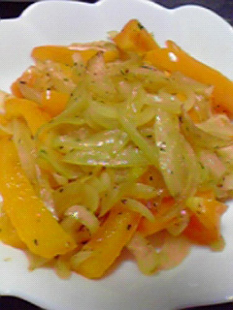 フライパンに油をしき、パプリカと玉ねぎを並べます。 |