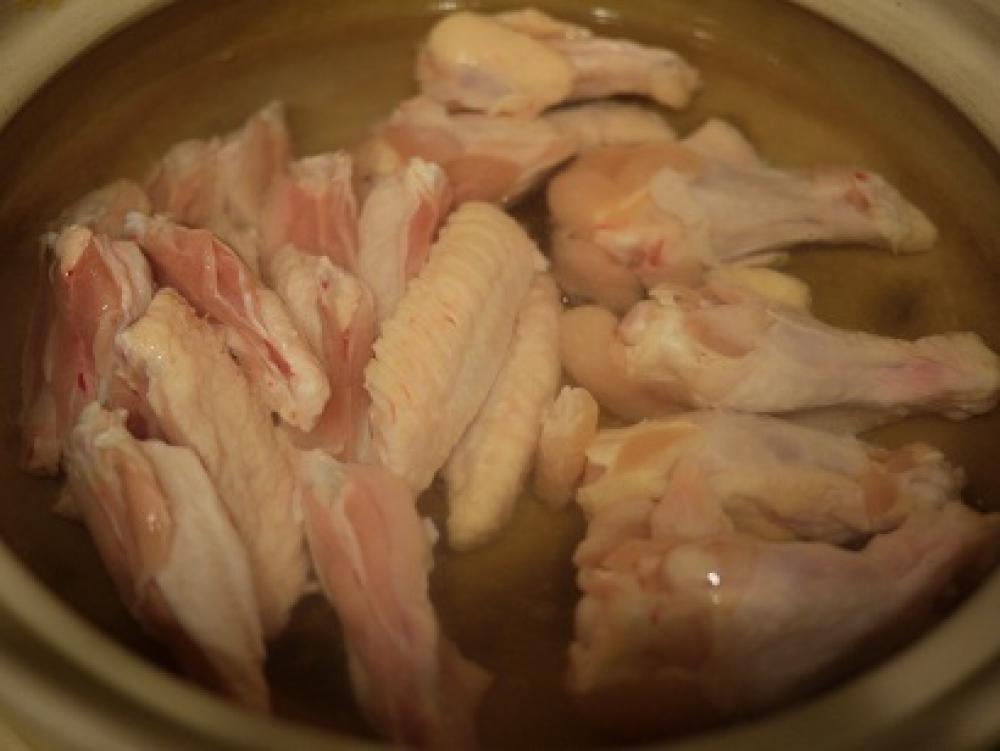 ![]() 水に手羽元・手羽先を入れ火にかけ、沸騰したら弱火でコトコト40分にこみます。