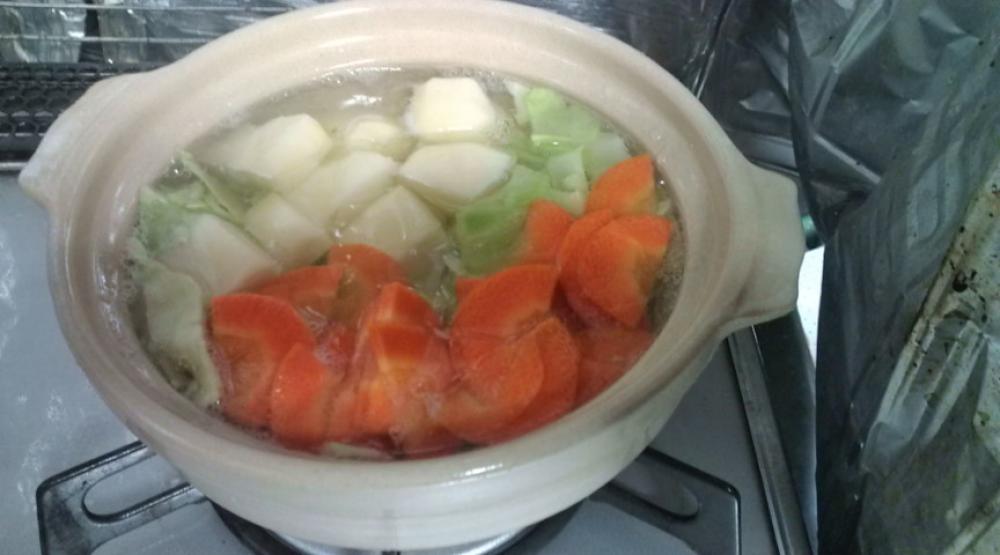 ![]() 野菜を小さめに切りごま油で炒め、鶏がらスープを注ぎ柔らかくなるまで煮込みます。