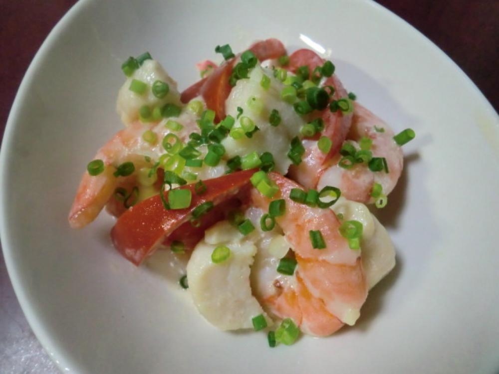 ホタテ、エビに塩、酒で下味をつけ、片栗粉をまぶし、熱湯でサッと下茹でして水気を切っておきます。
