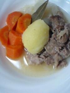 ジャガイモは1個を2~3つに切りニンジンは皮をむいて3cm厚さの半月切り、玉ネギは1個を4つに切ります。