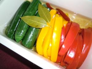 キュウリを洗って、軽く塩で表面をこすります。パプリカはヘタと種を取り、繊維にそって1cm幅に切ります。