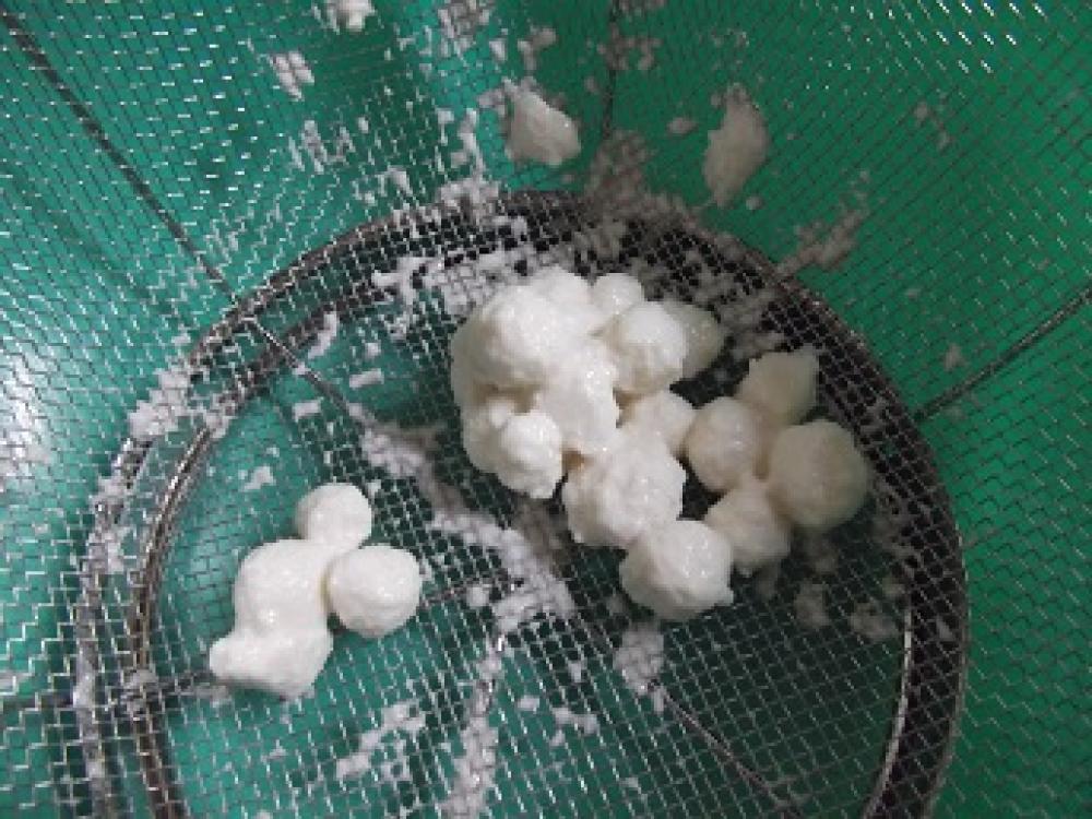 ![]() 1の豆腐を金の網でゆさゆさして丸くします。