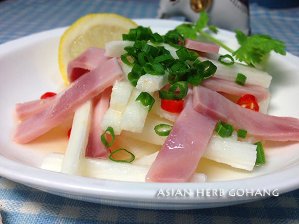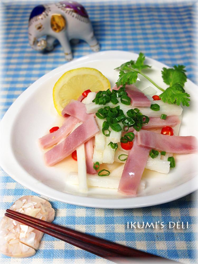![]() ハムは1X4cm、ながいもは7mm幅の短冊、細ねぎと唐辛子はみじんに切り、器に盛り付けます。