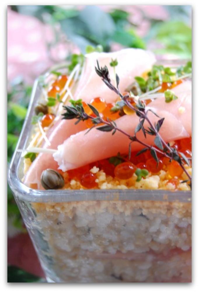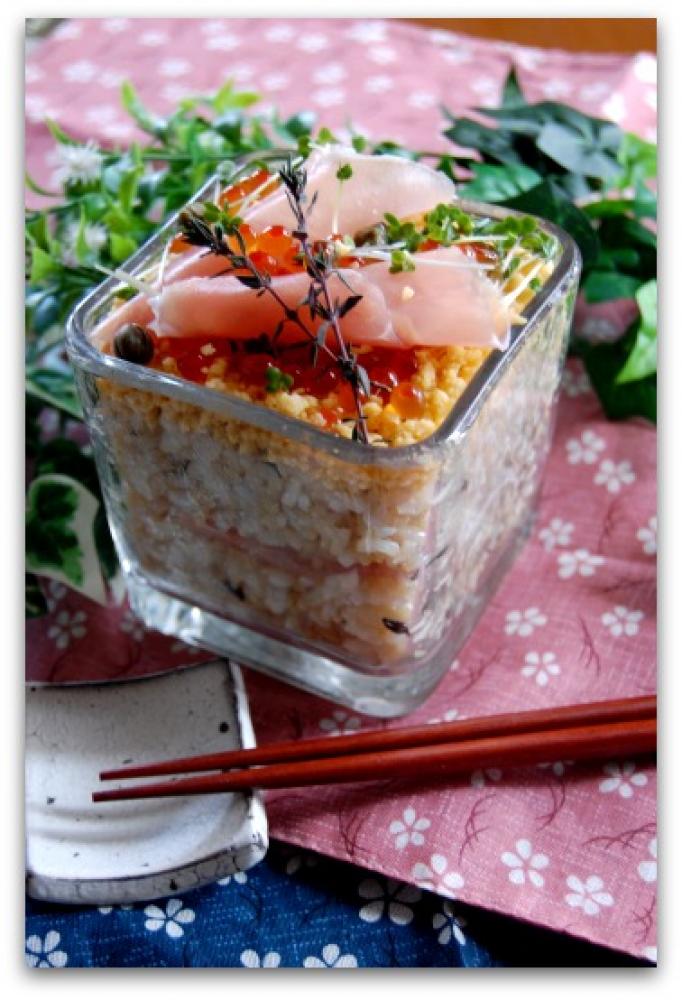 ガラスの容器に4を適量詰めて生ハムを乗せその上にさらに4を詰め、5の卵を乗せる。