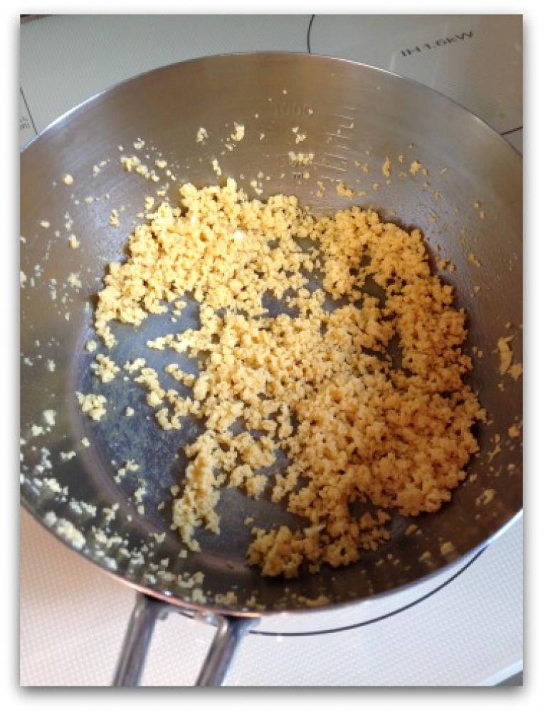 ![]() 卵は割りほぐしAで調味し小鍋にオリーブオイルを入れ、弱火にかけ菜箸5~6本使い混ぜながらポロポロになるまで炒める。