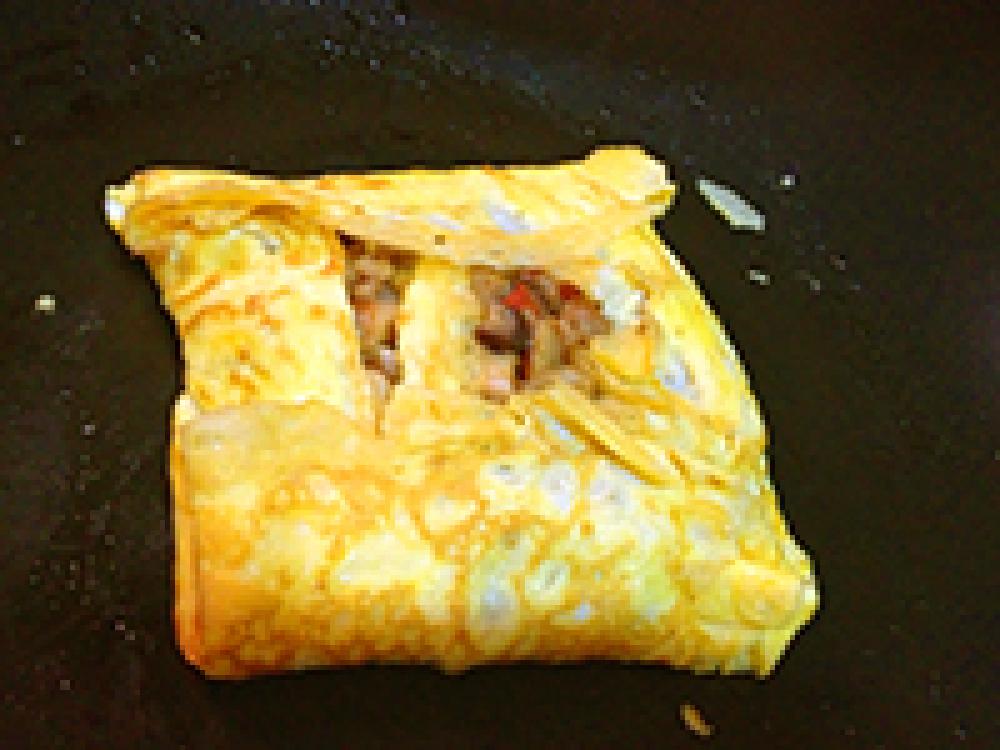 ![]() 底が丸い中華鍋スタイルのフライパンにオイルを入れて溶き卵を入れ、一度かき混ぜたら中央に具を置き、四方から包みます。