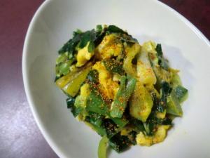 フライパンにゴマ油を熱し、ネギ、ニラの順に加え炒め、2を流し入れ、半熟になるまで炒め、塩、コショウで味を調えます。