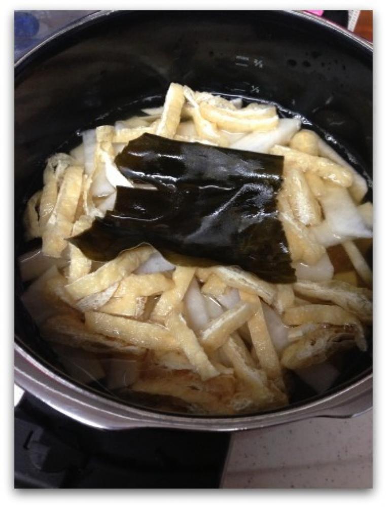 大根は皮付きのまますこし太めの短冊切りにし、油揚げは熱湯をかけ油抜きしてから縦半分に切り1cm幅に切る。