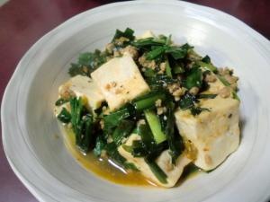 トウフは水切りし、2cm角に切り、ニラは1cm長さに切ります。
