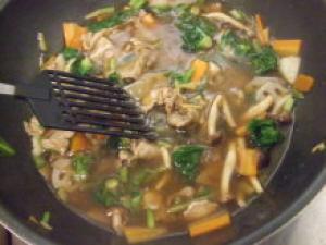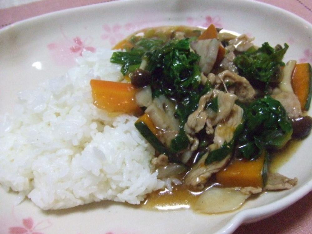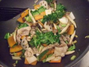 ![]() 2.フライパンにゴマ油を熱し、生姜・豚肉を炒め、色が変わったら葉もの以外の野菜を炒める。