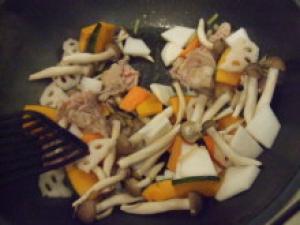 1.豚肉は食べやすい大きさに切る。にんじん・蓮根・かぶ・かぼちゃは薄切り、生姜は千切り、かぶの葉は食べやすい大きさに切る