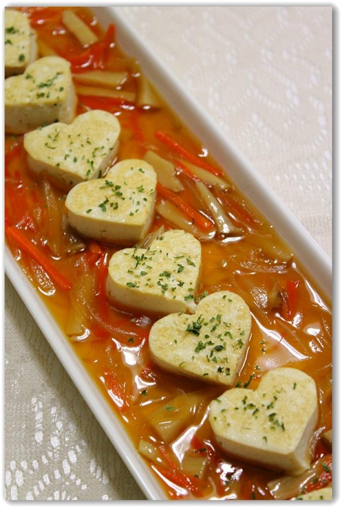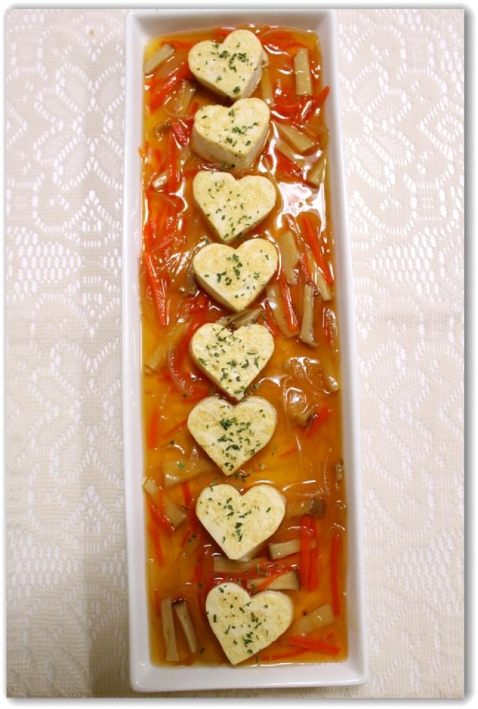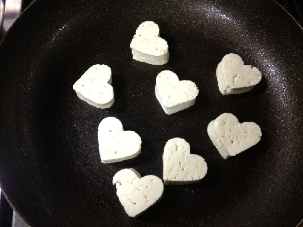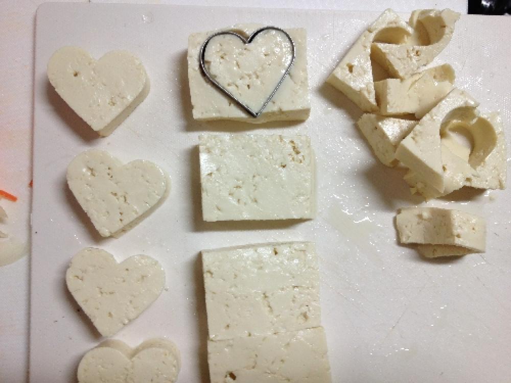 ![]() 豆腐は水切りし、1.5cm幅に切り、ハートの型でくり抜きます。