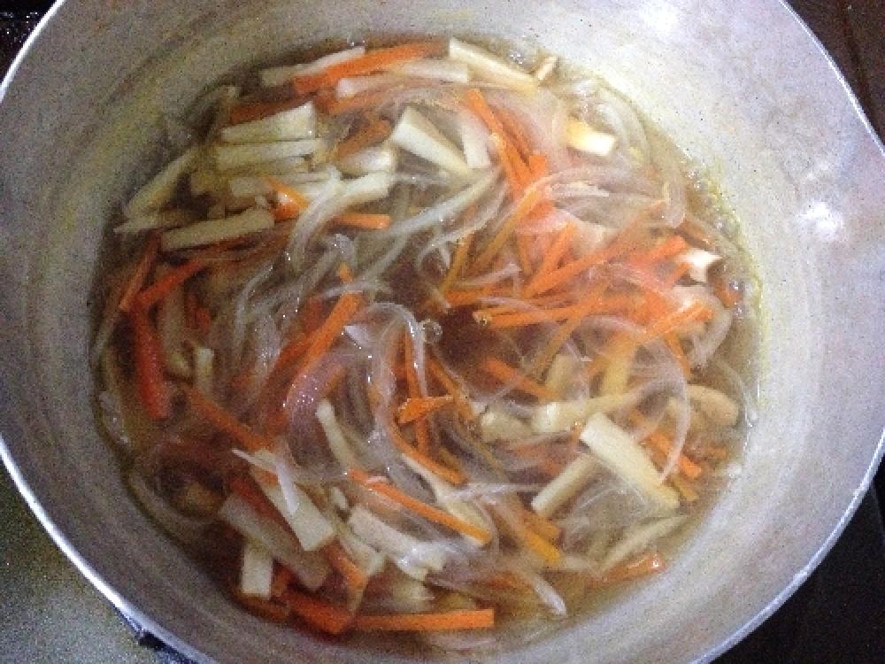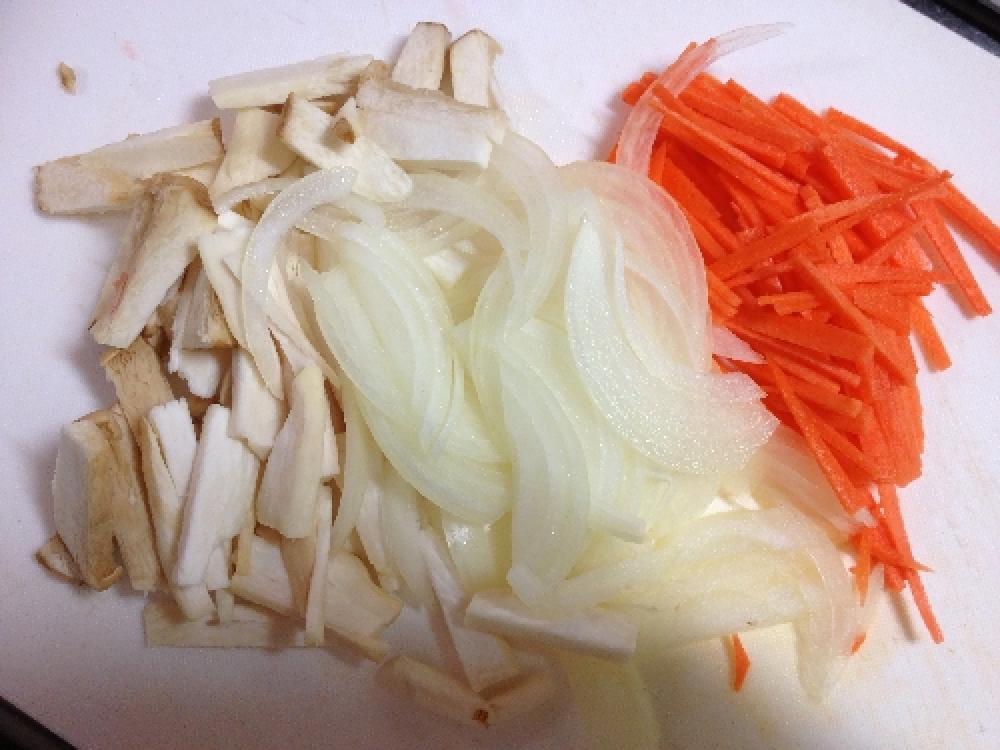 ![]() 玉ねぎは薄切り、人参、エリンギは細切りにします。
