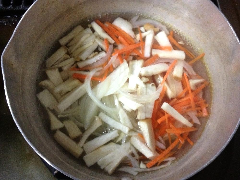 ![]() 鍋にAの水入れ、沸騰したら3の具材を入れ中火で煮ます。
