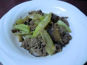肉の色が変わったらセロリ、シイタケの順に加えて炒めます。