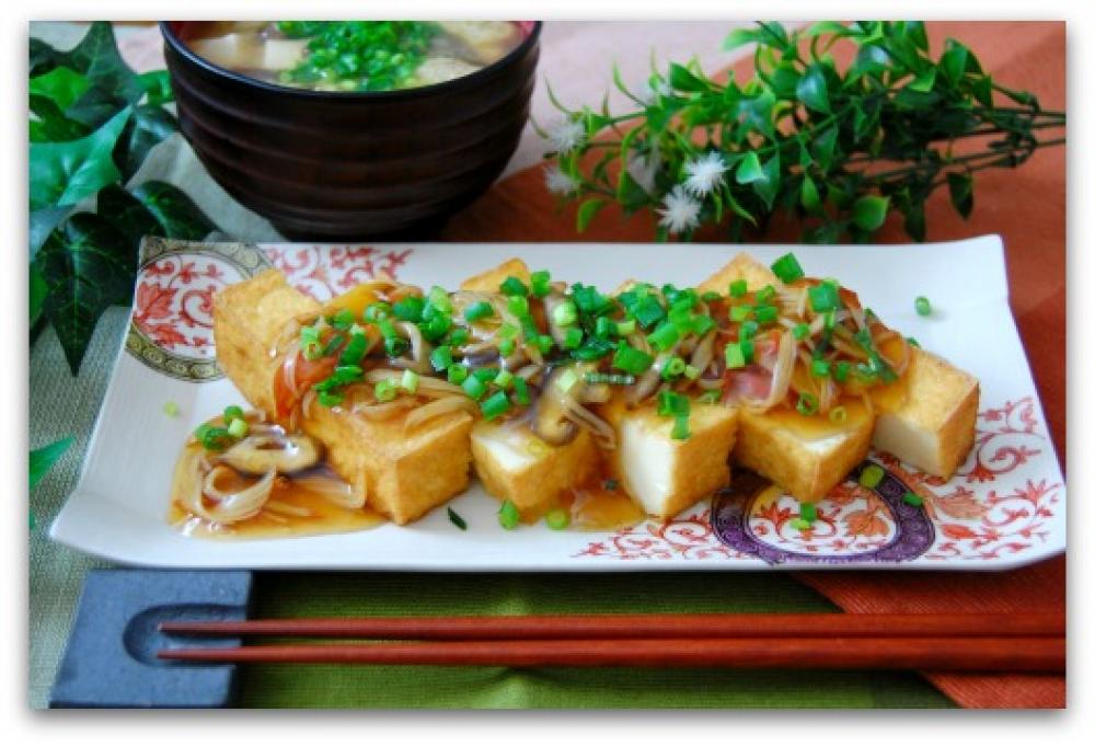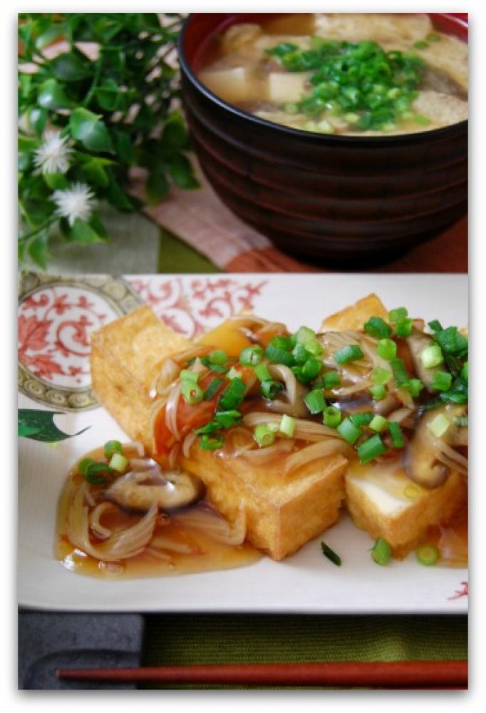 ![]() 厚揚げを4等分くらいに切り、4のあんをかけ、小口切りにした万能ねぎをちらして出来上がり。