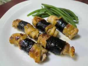 Aを1人分4個として等分し、広げた豚肉に薄く全体的にぬります。端からくるくると巻き、小麦粉をまぶし、海苔を巻きます。